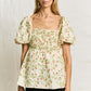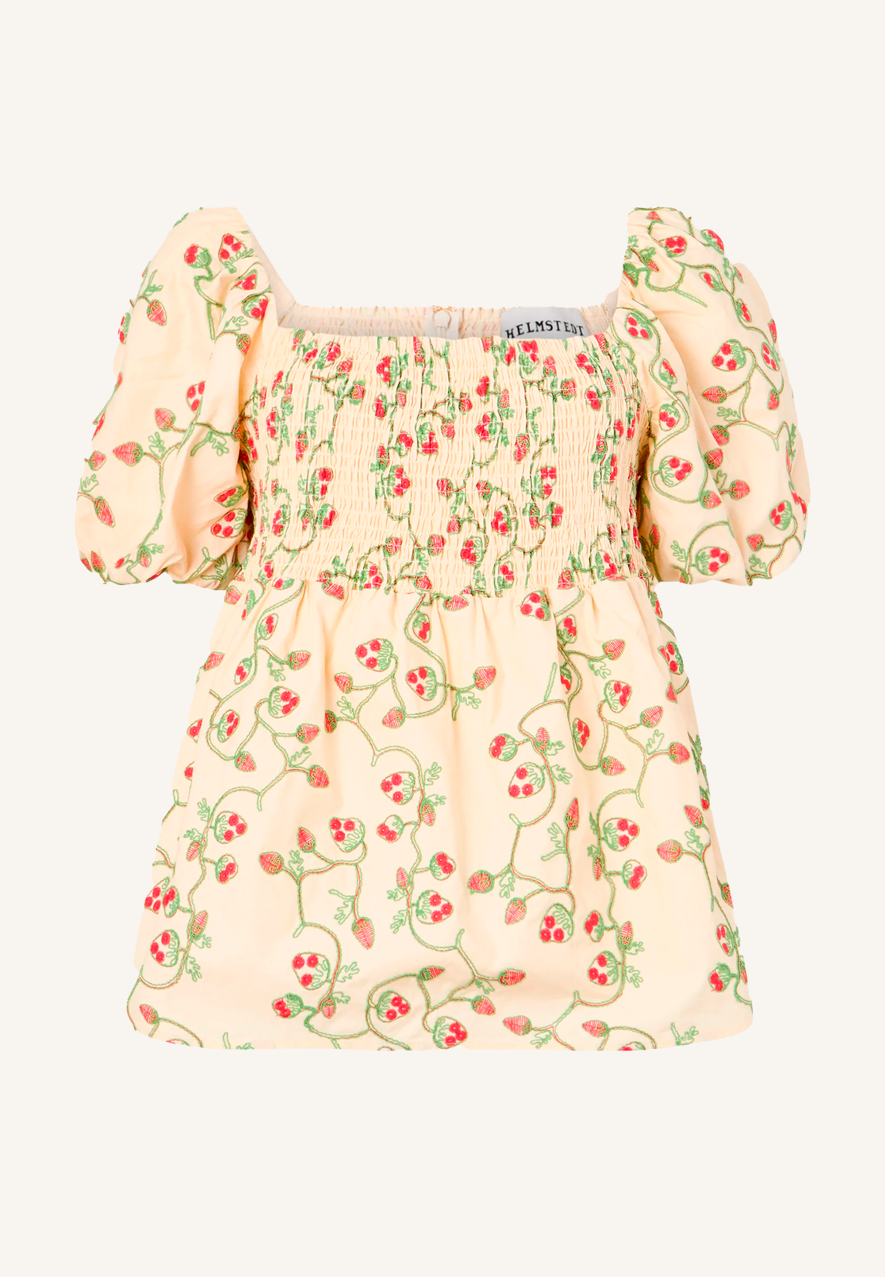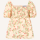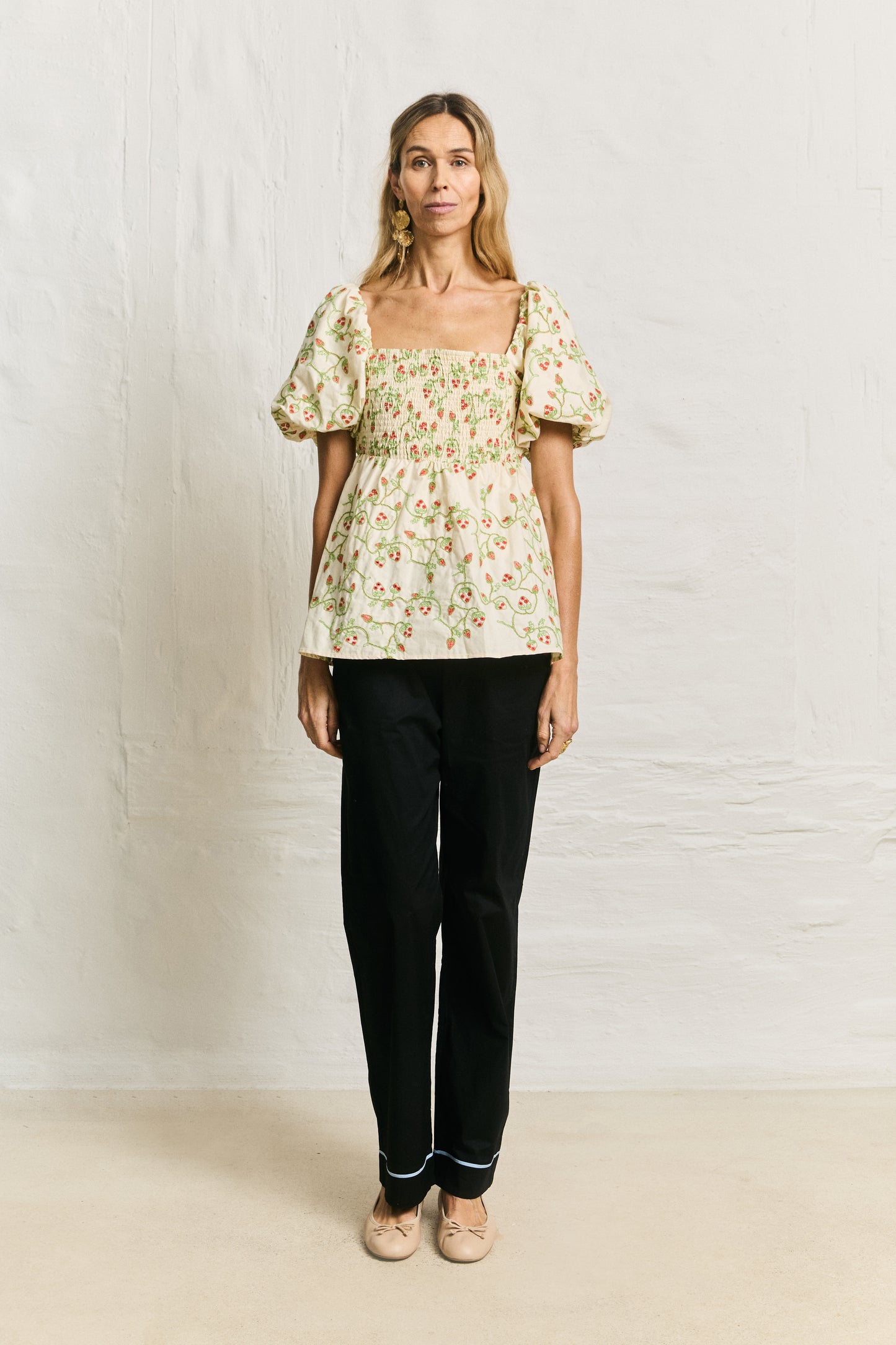 The Aya Top features a square neckline framed by voluminous puff sleeves with elasticated cuffs. The bodice is smocked for a fitted silhouette, leading into a softly flared hem. Made from lightweight cotton, the fabric is adorned with intricate embroidery anglaise in a floral pattern, adding texture and detail. The elasticated shoulders allow for a comfortable fit, and the overall design creates a balanced blend of structure and softness.