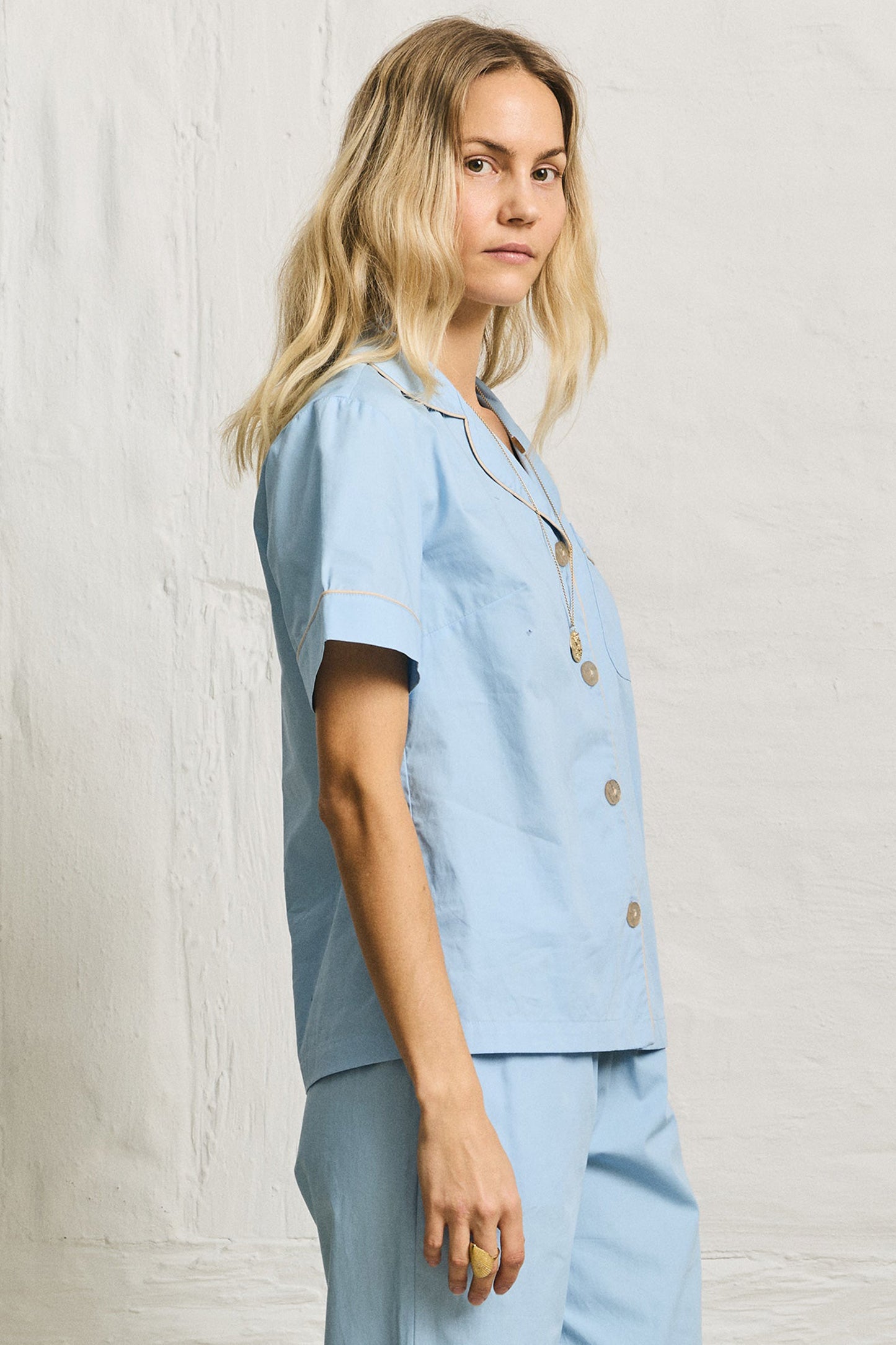 The Fiona Shirt is a classic button-down design, featuring intricate floral embroideries on the collar and chest. Contrasting piping accents the edges, adding a striking detail to the delicate design. With short sleeves and a tailored fit, this shirt blends elegance with a touch of vintage charm.