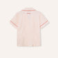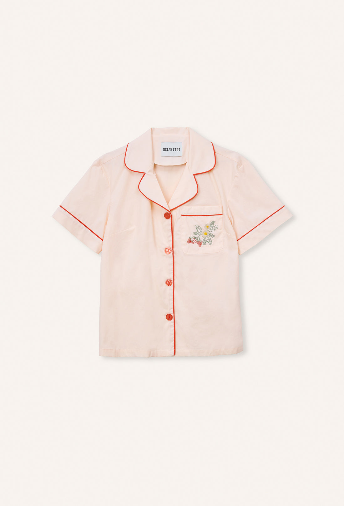 The Fiona Shirt is a classic button-down design, featuring intricate floral embroideries on the collar and chest. Contrasting piping accents the edges, adding a striking detail to the delicate design. With short sleeves and a tailored fit, this shirt blends elegance with a touch of vintage charm.