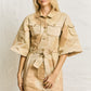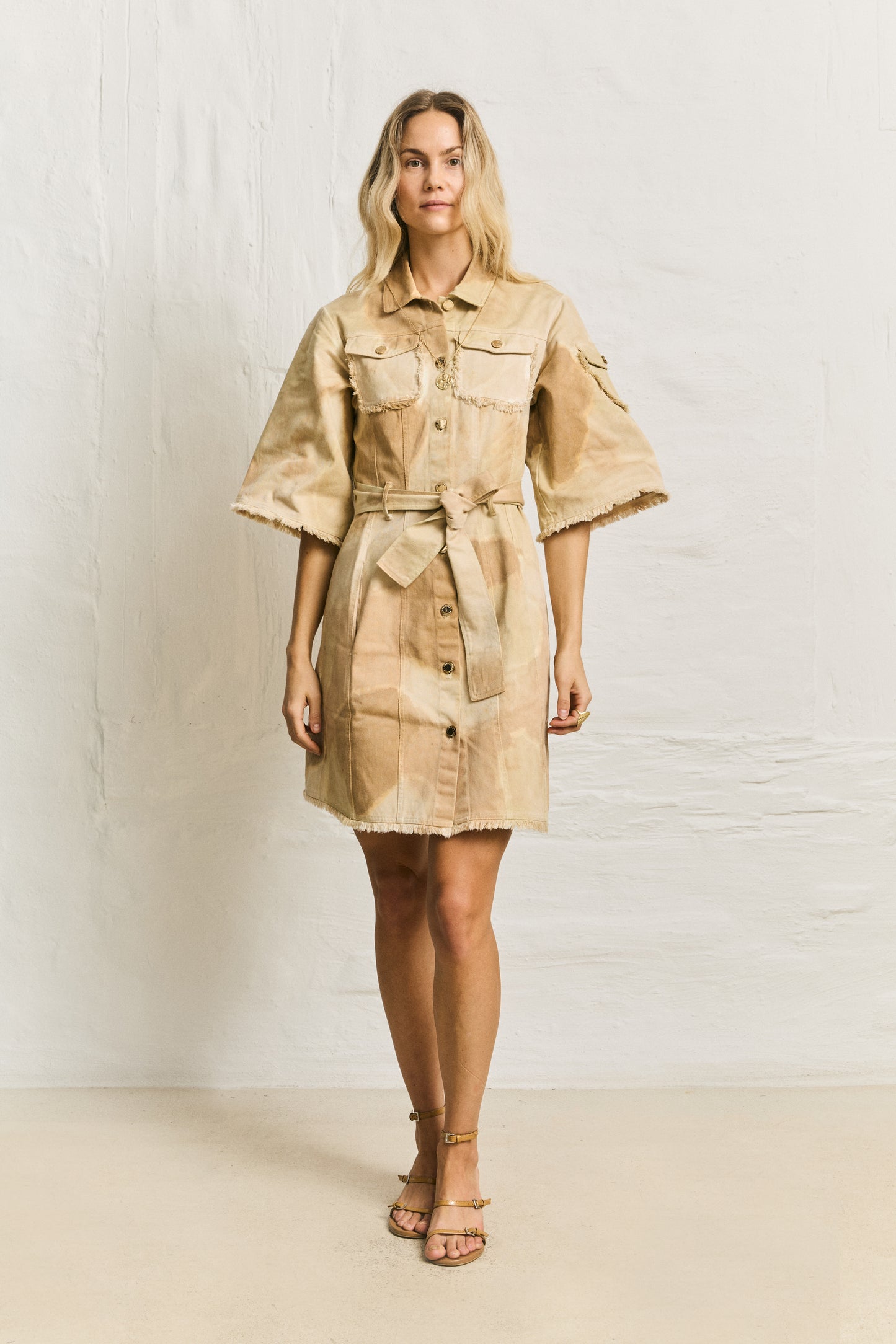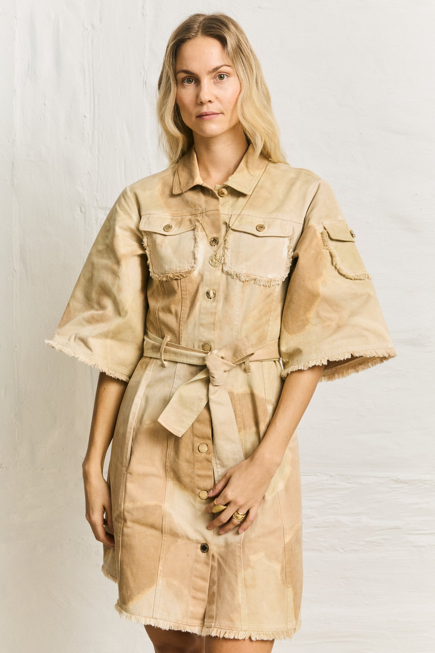 The Janice Denim Dress features a unique beige tie-dye print. It has mid-length, loose sleeves for a relaxed fit and an above-the-knee length for a casual, comfortable style. A full button closure extends from the bottom hem to the neckline, offering adjustable coverage and a classic look. The dress is completed with a matching denim belt, adding a refined touch to the design.