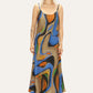 The Leva dress in the oasis print, reminds us of a warm summer day. The combination of these colours can create a unique feeling to a simple silk dress. The oasis print shows beautiful brush strokes on the dress. This maxi slip dress comes in all-over print. The dress has adjustable straps, darts at the chest and slits in both side seams.