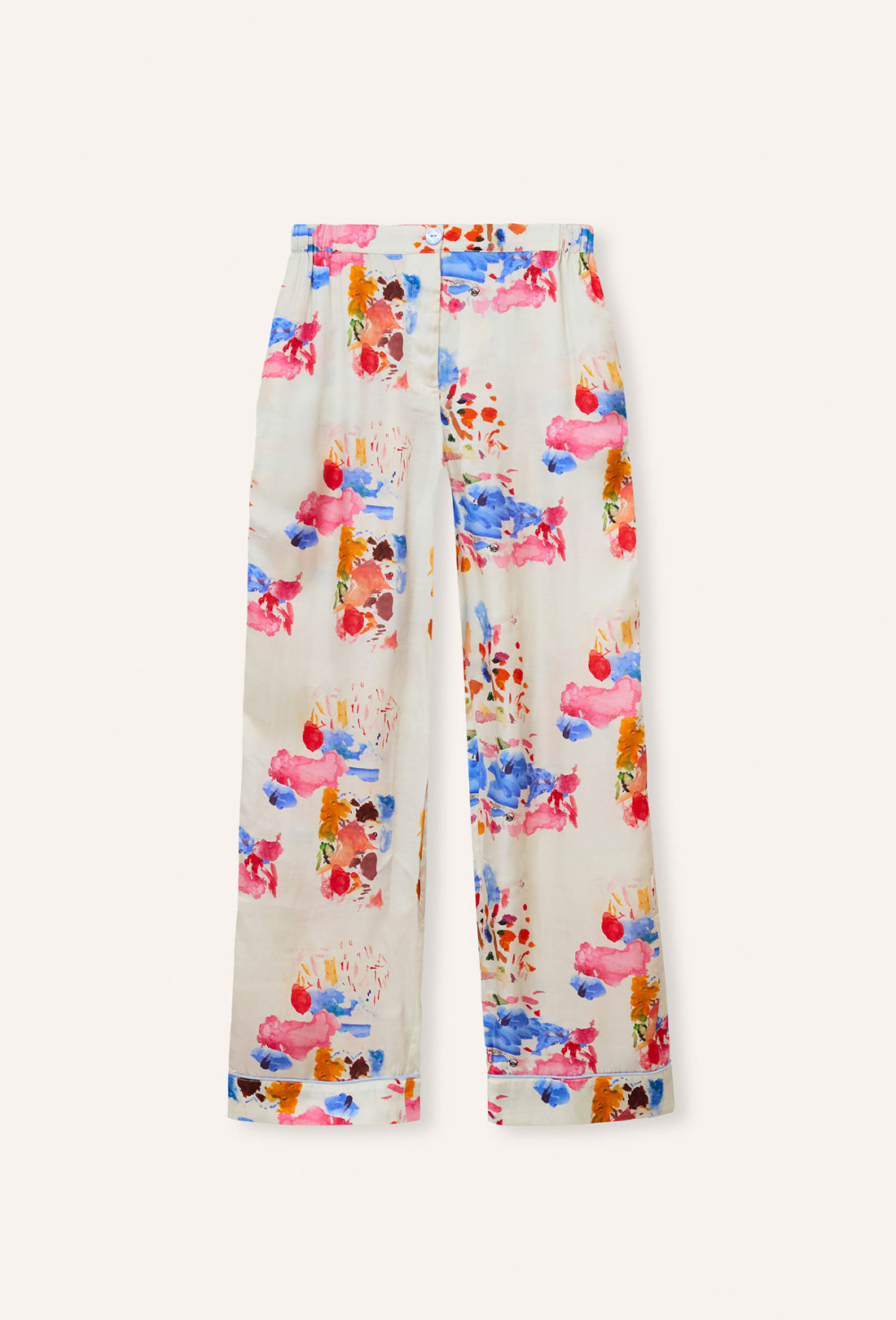 The Mizu pants are crafted from soft silk and feature an all-over hand-painted watercolor print, available in two distinctive designs: Atelier and Strawberry. The pants are designed with two front pockets and two back pockets, offering both style and functionality.