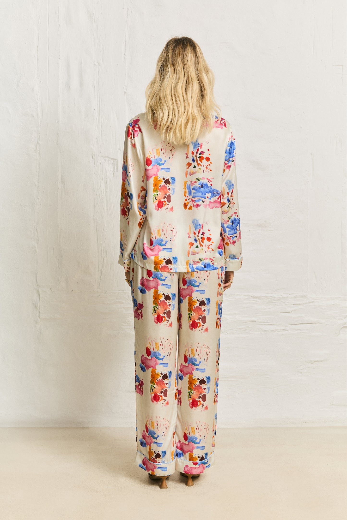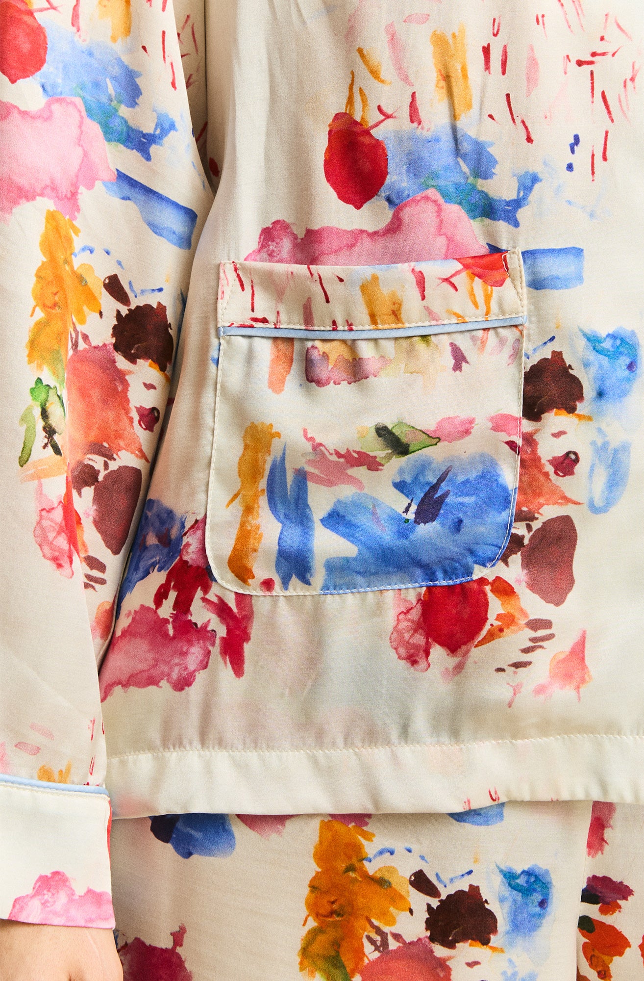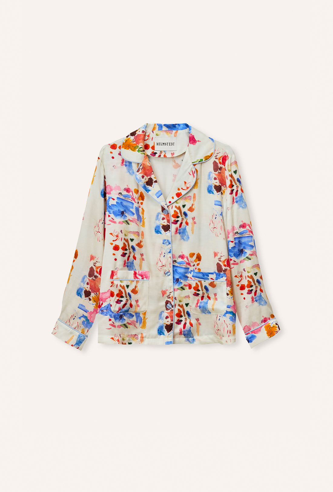 The Mizu shirt features an all-over hand-painted watercolor print, available in two distinctive designs: Atelier and Strawberry. The shirt is designed with two front pockets and fastens with logo buttons at the center front, offering a functional yet stylish look.