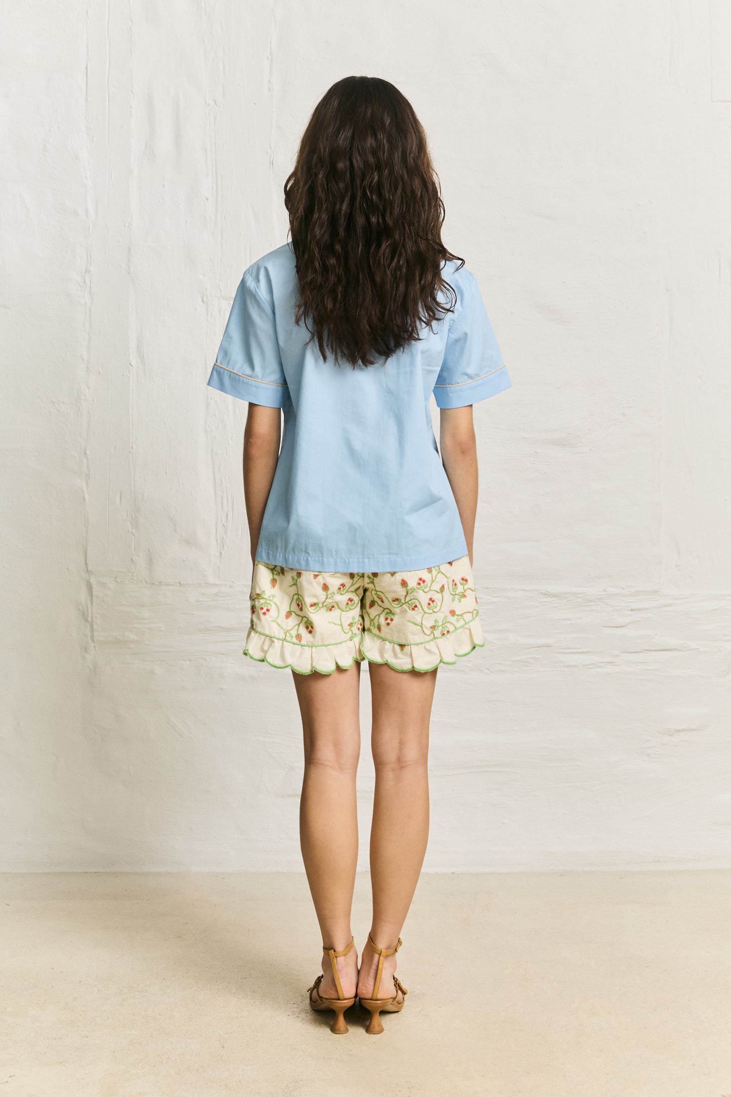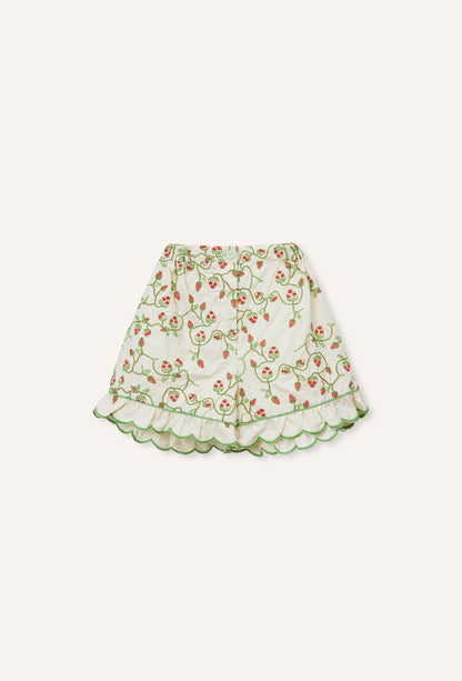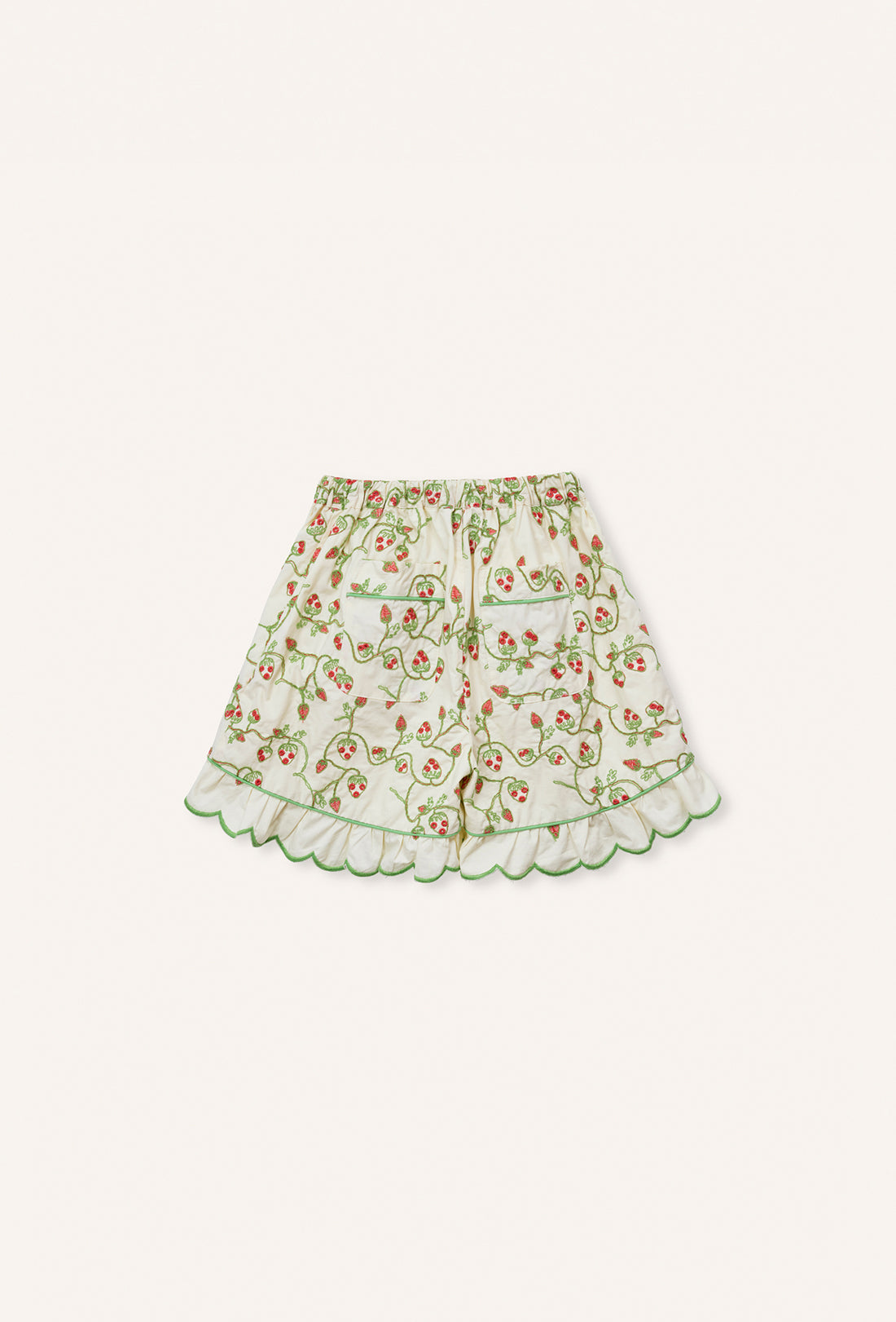 The Mizu Shorts are crafted from soft cotton with broderie anglaise embroidery, blending playful detailing with a functional silhouette. The intricate strawberry motif brings depth and a natural charm, while the scalloped hem with contrasting green accents adds a refined edge. Designed with a relaxed fit and an elasticated waistband for ease and comfort, these shorts offer effortless versatility for warmer days. The Mizu Shorts highlight artisanal craftsmanship with a focus on both style and practicality.