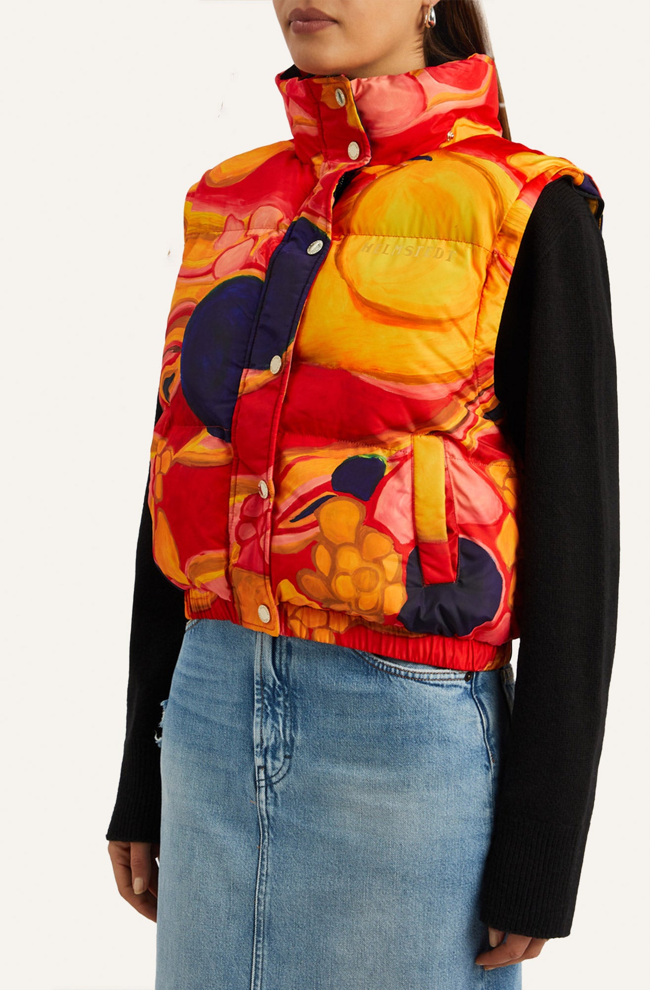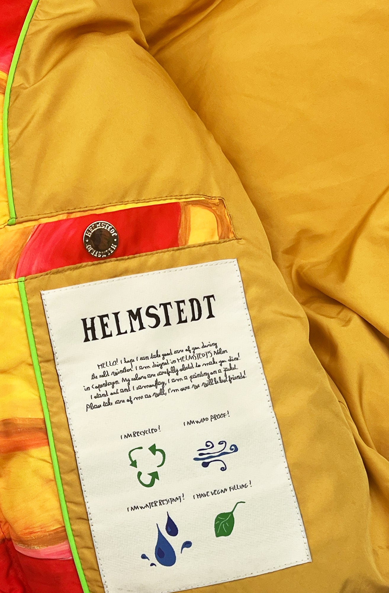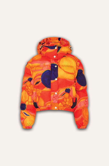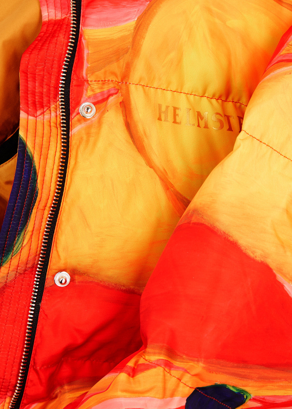 Short puffer jacket in all-over print in a wind and repellent material. The planet print is inspired by the red colors of the planet Mars. The print is made with acrylic colors where big visible pencil strokes make a flowy motif in bold colors. The jacket has a high collar and detachable sleeves which can turn it into a vest. Elastic at wrists and at bottom hem. Two pockets on the front. Placket at front with HELMSTEDT logo buttons and HELMSTEDT logo zipper.