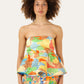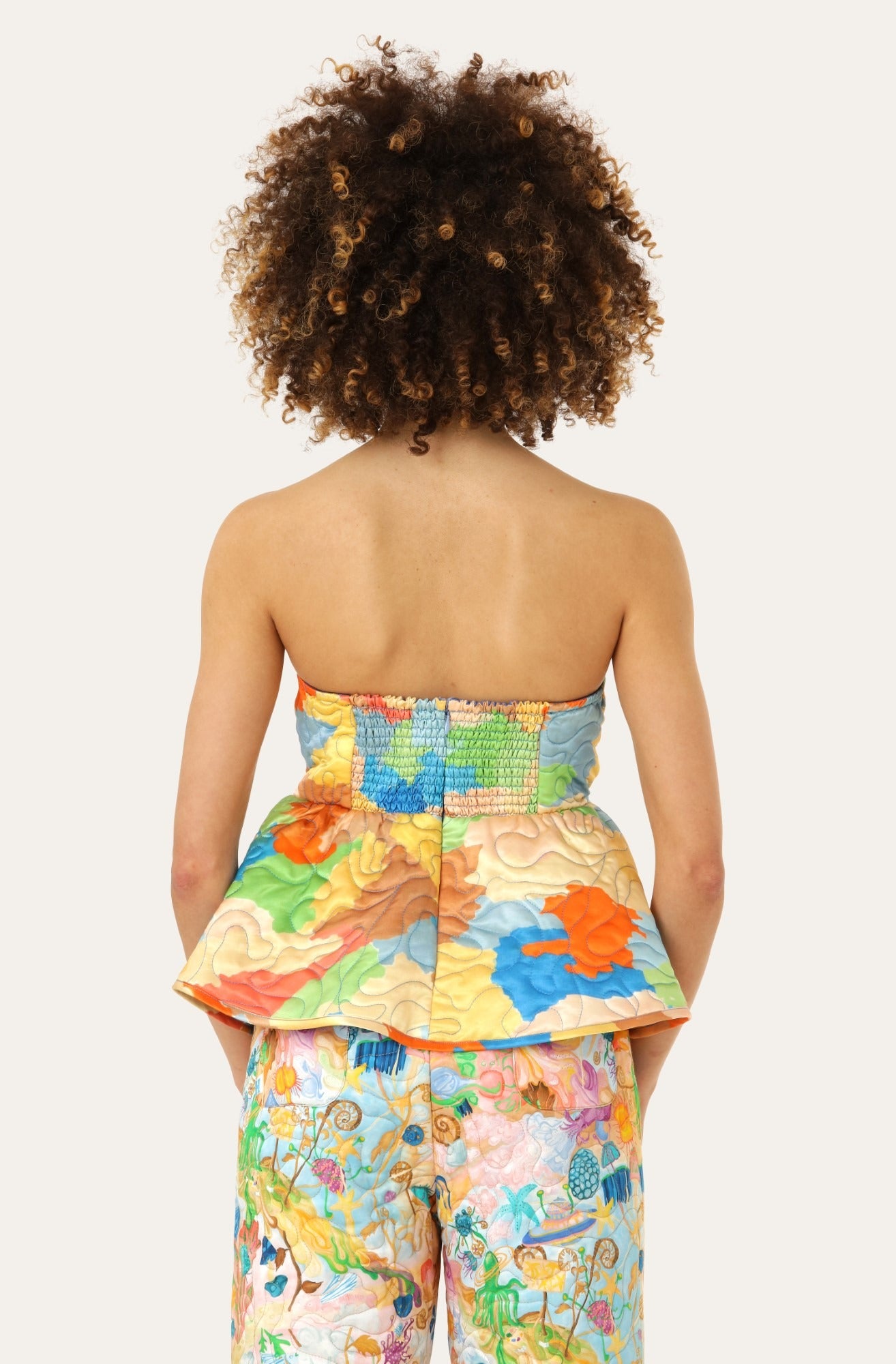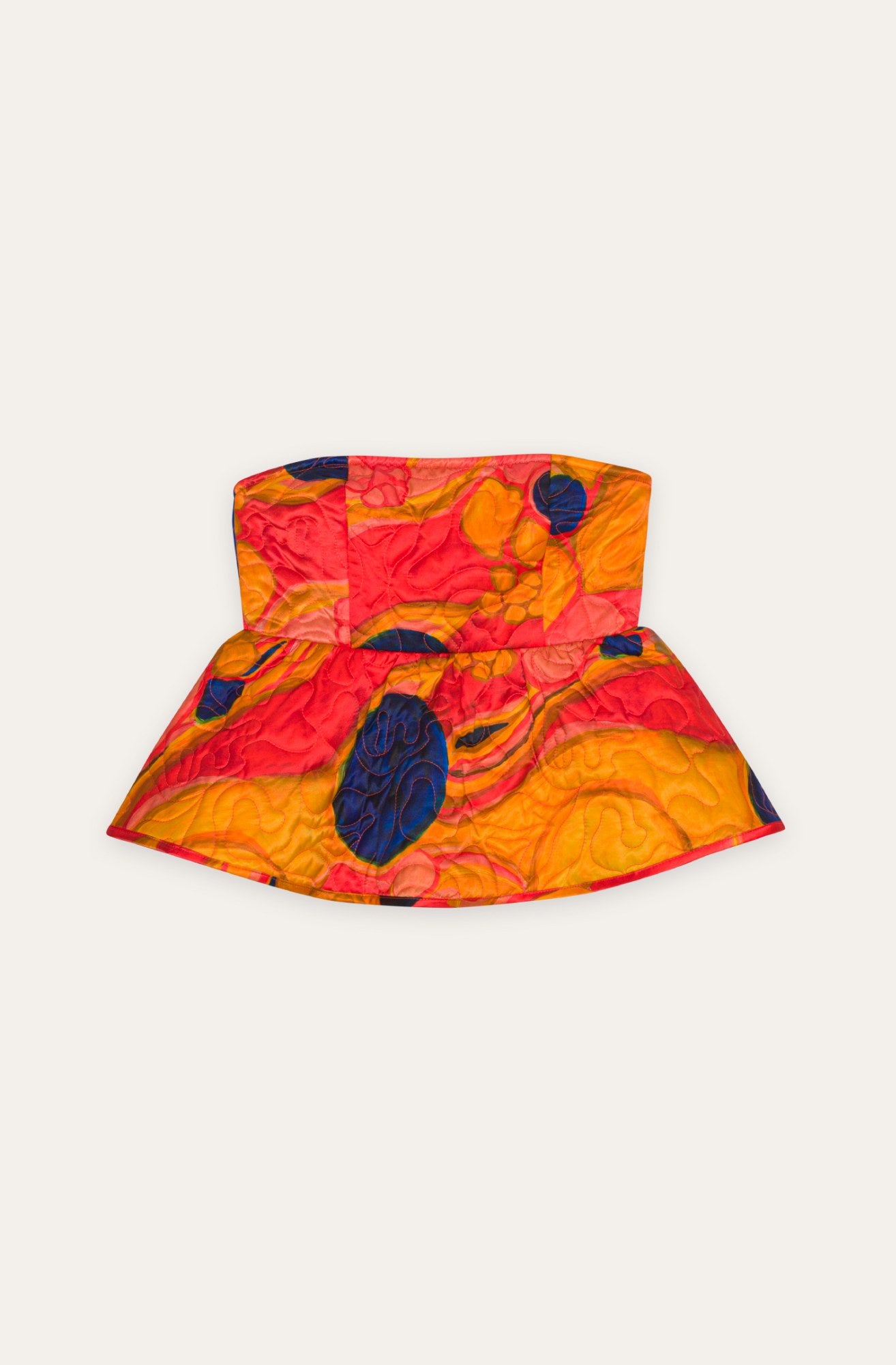 Quilted top with sweetheart neckline in all-over print. The top is available in two different prints. The planet print is inspired by the red colors of the planet Mars. The print is made with acrylic colors where big visible pencil strokes make a flowy motif in bold colors. The other option of the top comes in a print of colorful dots mixed in between each other coming together as a playful interpretation of the different planets around the universe.