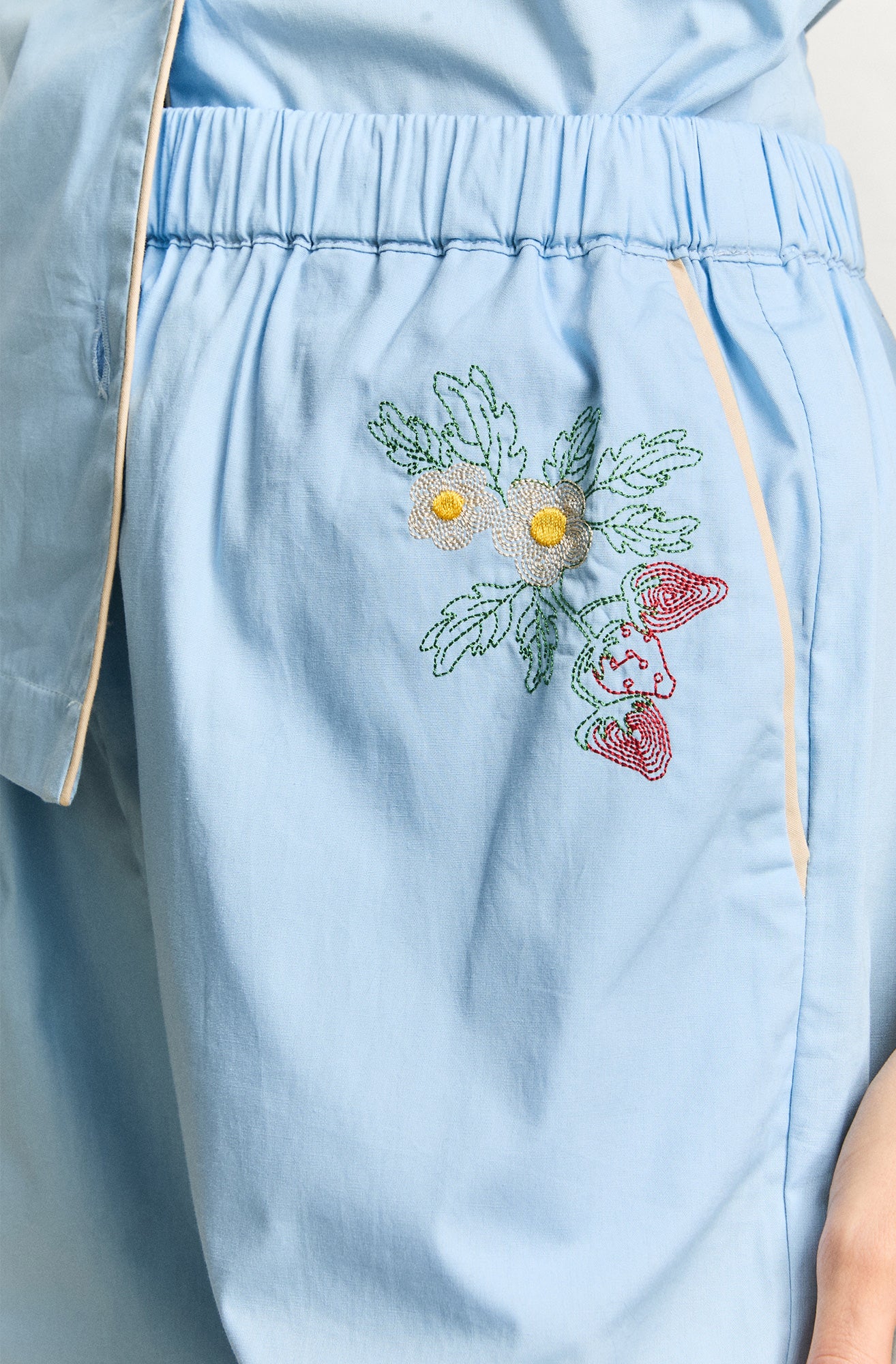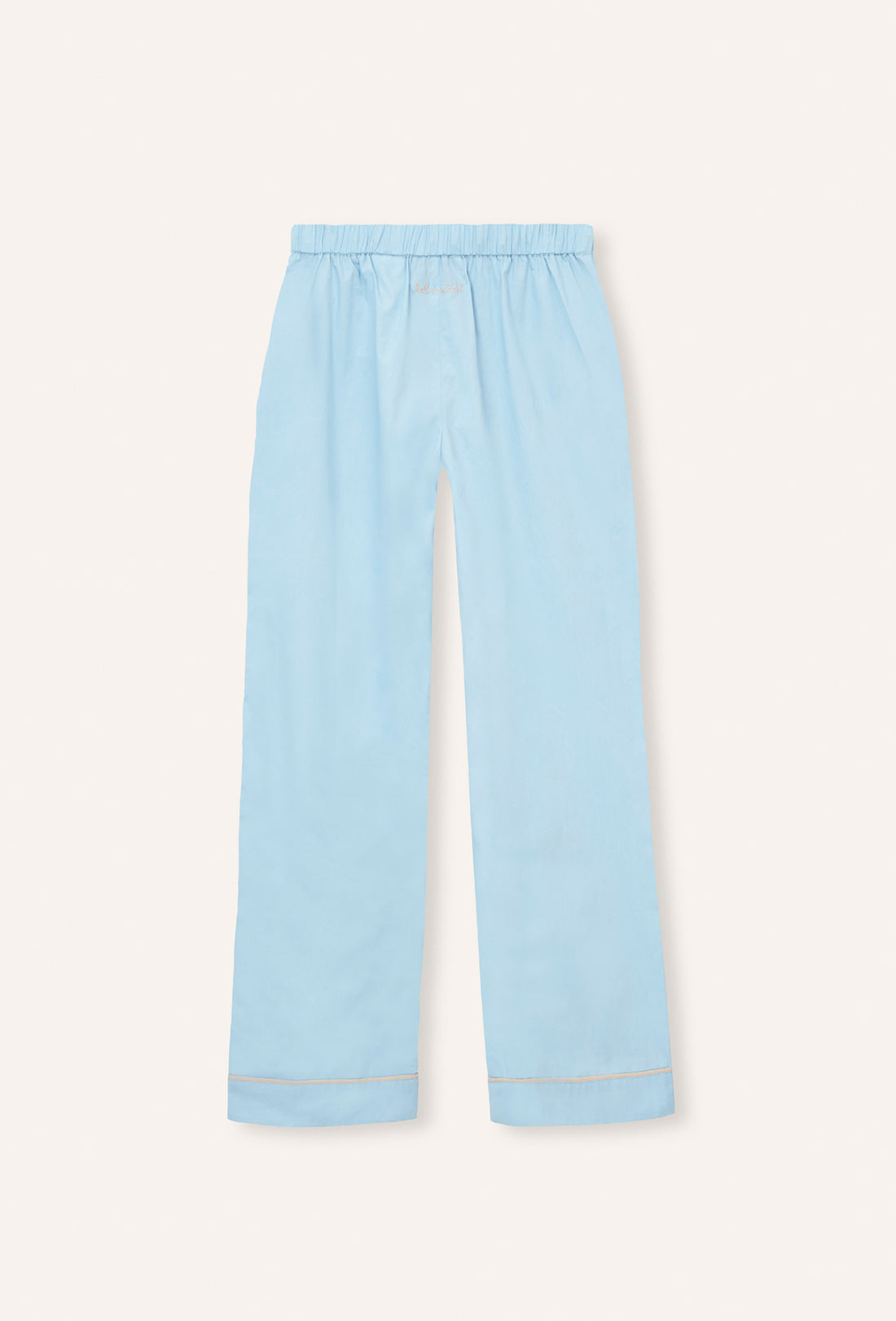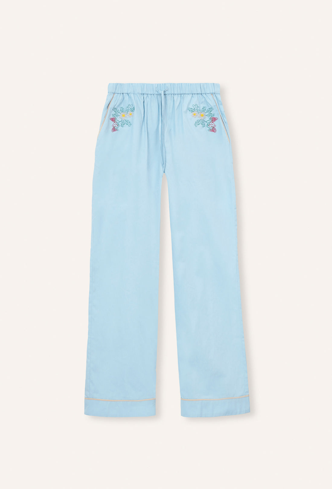 The Fiona Pants are adorned with delicate floral embroideries on the front, combining elegance with comfort. Featuring an elasticated waistband with a drawstring, they ensure ease of wear. Subtle piping details at the hem add a refined touch, while the relaxed fit creates a timeless silhouette.