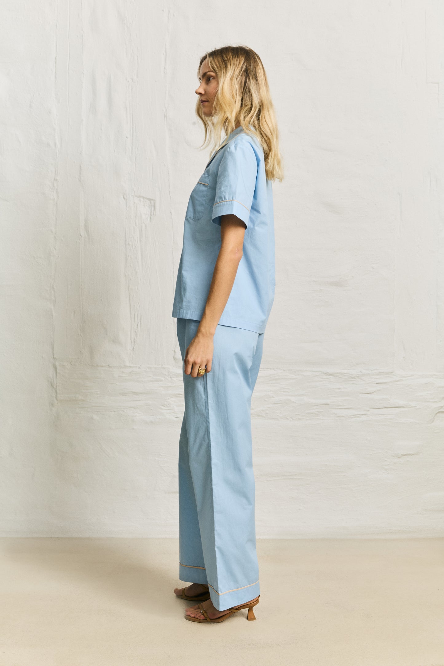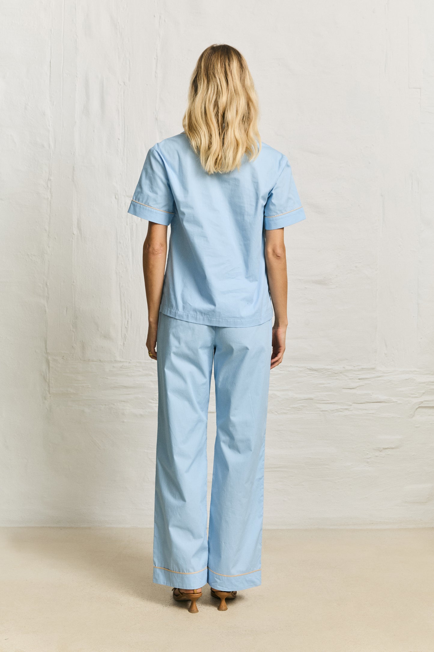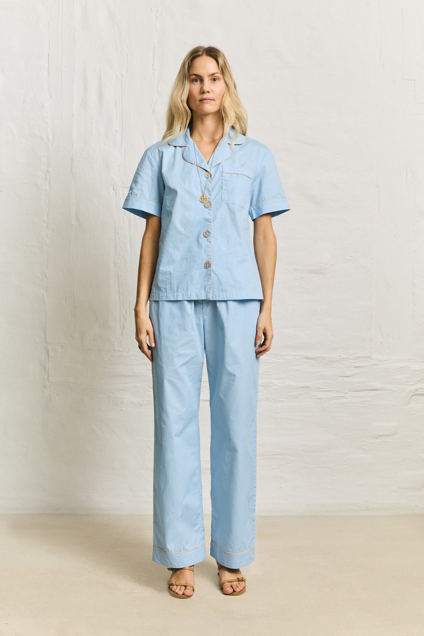 The Fiona Pants are adorned with delicate floral embroideries on the front, combining elegance with comfort. Featuring an elasticated waistband with a drawstring, they ensure ease of wear. Subtle piping details at the hem add a refined touch, while the relaxed fit creates a timeless silhouette.