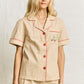 The Fiona Shirt is a classic button-down design, featuring intricate floral embroideries on the collar and chest. Contrasting piping accents the edges, adding a striking detail to the delicate design. With short sleeves and a tailored fit, this shirt blends elegance with a touch of vintage charm.