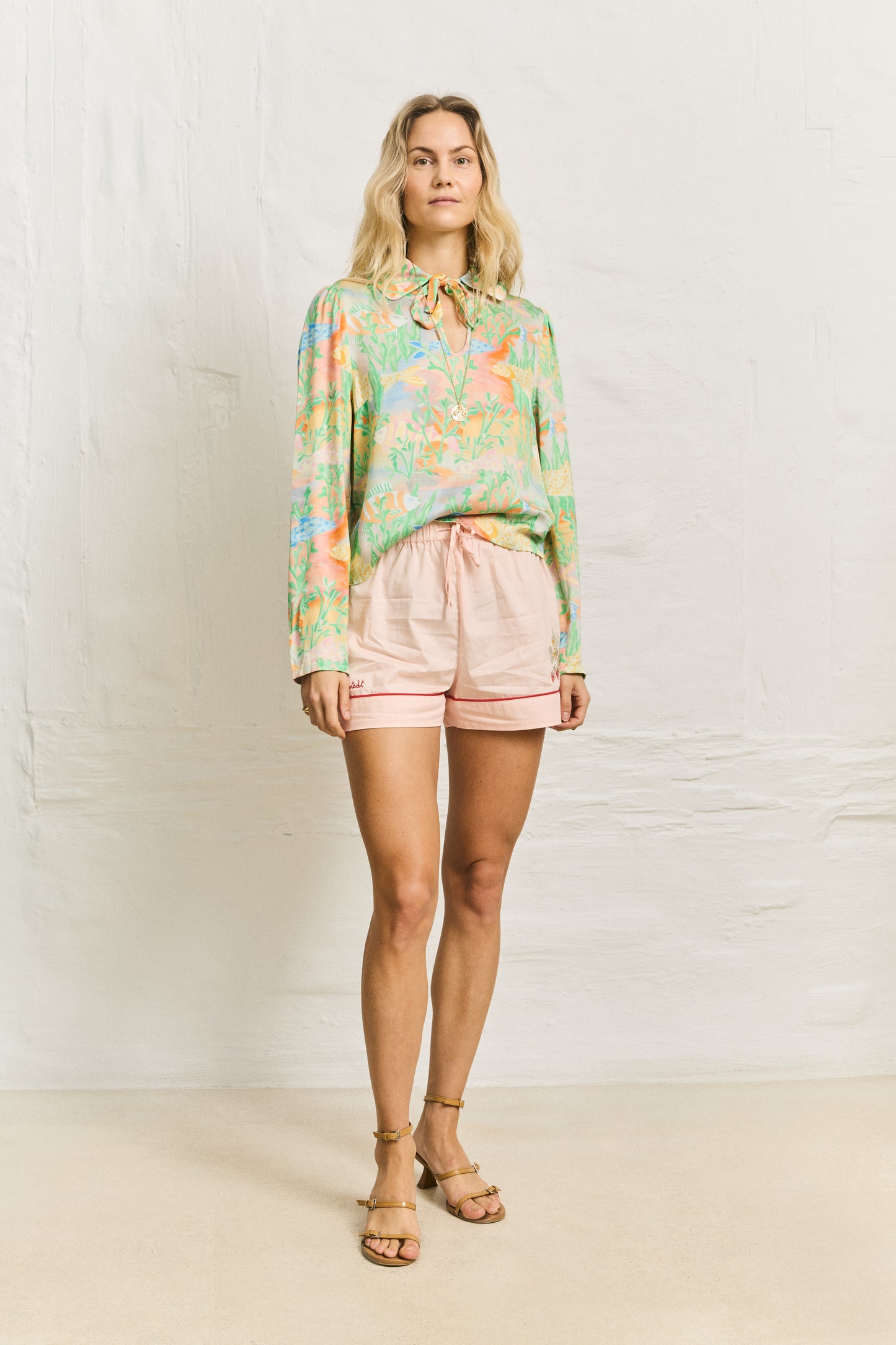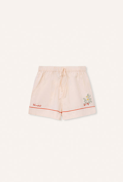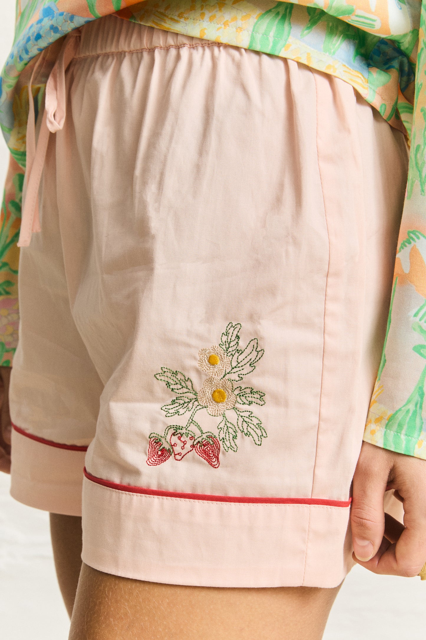 The Fiona Shorts are adorned with delicate floral embroideries on the front, combining elegance and comfort. Designed with an elasticated waistband and drawstring, they ensure ease of wear. Subtle piping details at the hem add a refined touch, while the relaxed fit offers effortless versatility.