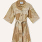The Janice Denim Dress features a unique beige tie-dye print. It has mid-length, loose sleeves for a relaxed fit and an above-the-knee length for a casual, comfortable style. A full button closure extends from the bottom hem to the neckline, offering adjustable coverage and a classic look. The dress is completed with a matching denim belt, adding a refined touch to the design.