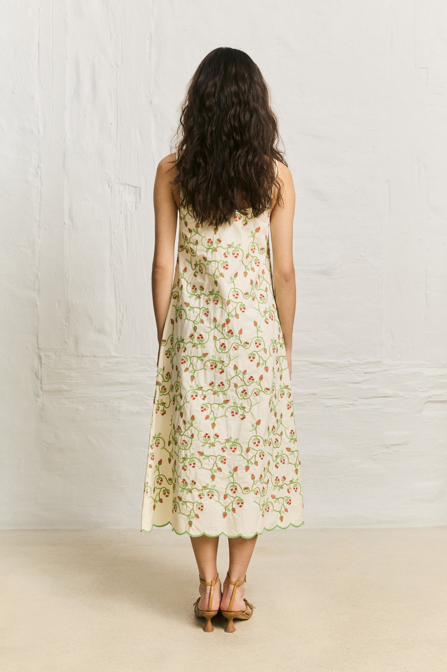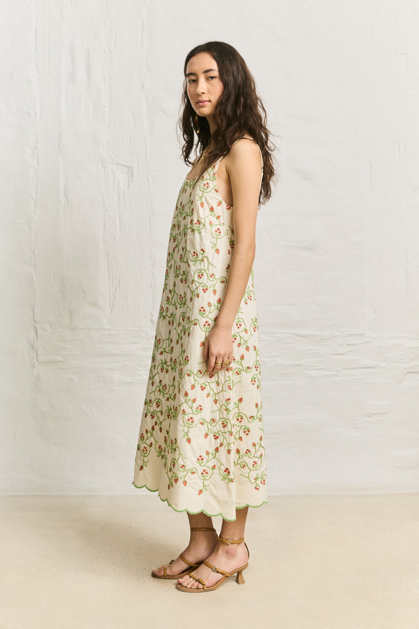 The Leva Dress is crafted from lightweight cotton with intricate broderie anglaise embroidery, featuring a playful berry and vine motif. Its flowing A-line shape and scalloped hem with soft green accents create a relaxed yet detailed look. Designed with adjustable straps, it’s a versatile piece for warm days, combining comfort and charm effortlessly.