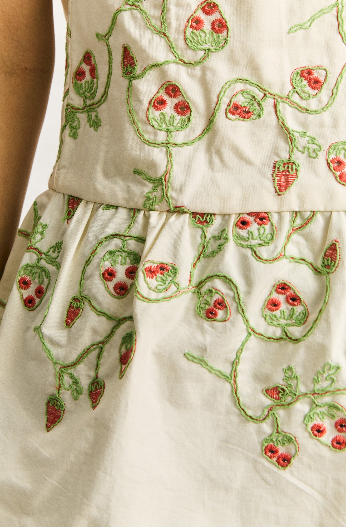 The Mira Top is a lightweight cotton piece featuring intricate broderie anglaise and a flattering peplum silhouette. Delicate straps and a soft neckline enhance its understated design, while the embroidered pattern of strawberries and green vines adds vibrancy and texture. The scalloped hem provides a clean yet playful finish, complementing the top's relaxed fit. Ideal for layering or wearing on its own, the Mira Top combines craftsmanship with comfort for versatile styling.